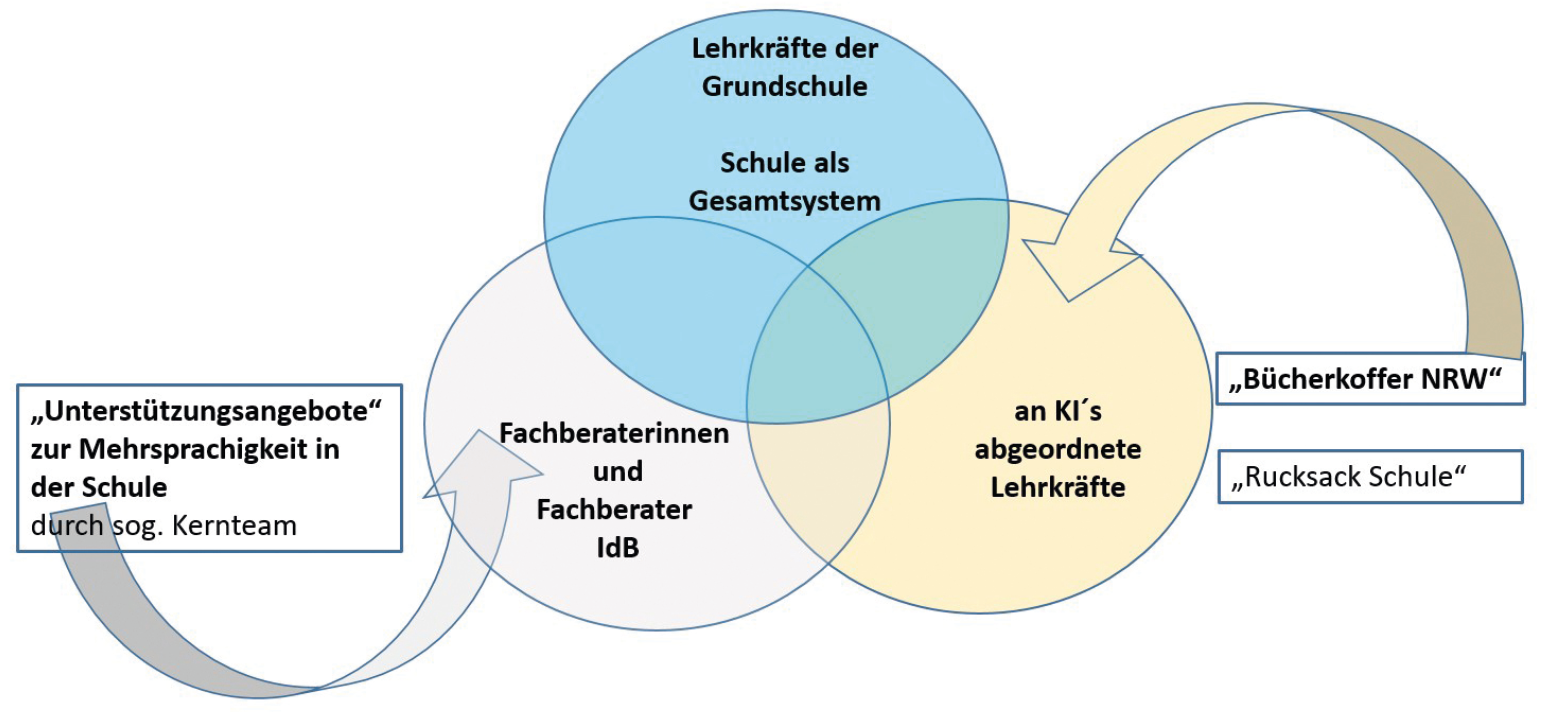 Dafür erhalten die Fachberaterinnen und Fachberater Integration durch Bildung der Schulaufsicht ein mehrstufiges Unterstützungsangebot zur mehrsprachigen Unterrichts- und Schulentwicklung. Ein Kernteam, dem Frau Rosella Benati, Frau María Sánchez Oroquieta, Herr Franz Kaiser Trujillo und die Programmleitung angehören, sichert durch fachliche Expertise den notwendigen Austausch und einen Kompetenztransfer der Fachberaterinnen und Fachberater. Dieses mit dem Ziel, Grundlagen und mehrperspektivische Inhalte für standortbezogene und teilweise unterschiedliche Mehrsprachigkeitsprogramme der Grundschulen zu erarbeiten und darzustellen.