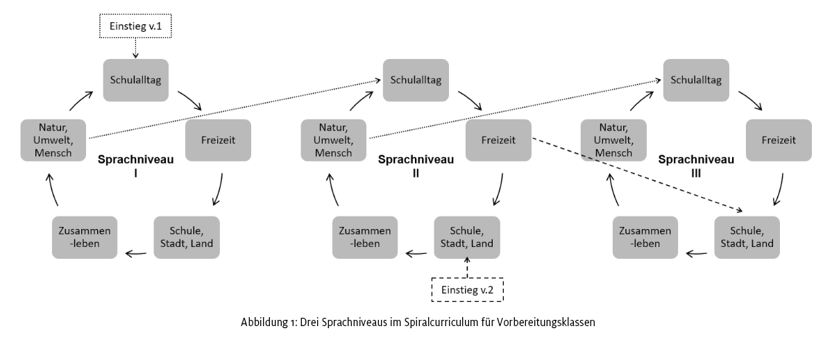 Das Curriculum berücksichtigt Erkenntnisse zum Zweitspracherwerb und aktuelle Entwicklungen im Bereich der Mehrsprachigkeitsdidaktik. Durch die Anlage als Spiralcurriculum werden Fächer und entsprechende Inhalte im Verlauf eines Schuljahres erneut und differenziert für verschiedene Sprachniveaus aufgegriffen. Zudem wird das fächerübergreifende Arbeiten bereits ab dem ersten Tag ermöglicht. Zur Binnendifferenzierung werden drei Sprachniveaus parallel angeboten: Das Niveau I des Curriculums entspricht in etwa dem GeR-Niveau A1. Es führt über das Niveau II zu den GeR-Niveaus A2.1 für produktive und A2.2 für rezeptive Sprachverwendung. Abgeschlossen wird der Vorkurs mit dem Niveau III, welches produktiv dem GeR-Niveau A2 und rezeptiv dem GeR-Niveau B1 (auch threshold-Niveau genannt) entspricht. Nach dem erfolgreichen Beenden des Vorkurses und mit weiterer, kontinuierlicher sprachlicher und fachlicher Unterstützung ist damit eine beginnende Teilnahme am Regelunterricht möglich. Das Curriculum der Vorbereitungsklasse orientiert sich an den Curricula der Regelklasse, sowohl hinsichtlich der bearbeiteten Lerninhalte als auch der (fach-)sprachlichen Auseinandersetzung mit diesen, und sorgt so für eine Verzahnung von Vorbereitungs- und Regelklasse. In Abbildung 1 in Version 1 ist dargestellt, wie ein:e Schüler:in ohne sprachliche Vorkenntnisse auf dem Niveau I neu einsteigt. Dies ist stets mit dem aktuell im Unterricht behandelten Thema möglich. In Version 2 wird beispielhaft dargestellt, wie ein:e Schüler:in mit ausreichenden Vorkenntnissen auf Niveau II mit dem aktuellen Thema startet und, nachdem der Themenkreis durchlaufen wurde, auf Niveau III fortsetzt (3).