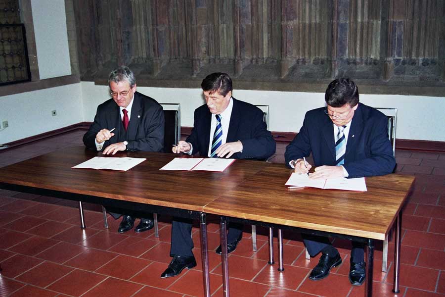 Unterzeichnung des Kooperationsvertrages Prof. Dr. Axel Freimuth, Fritz Schramma, Hans-Peter Lindlar (v.l.)